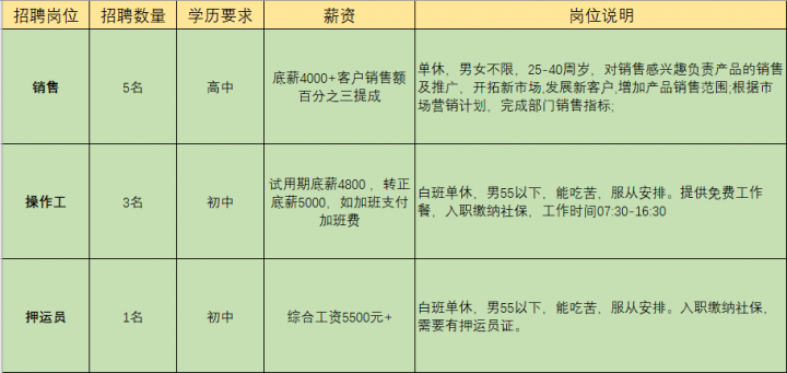 招工1,操作工若干(男女不限),要求工作认真负责,身体健康;2,公司提供工...